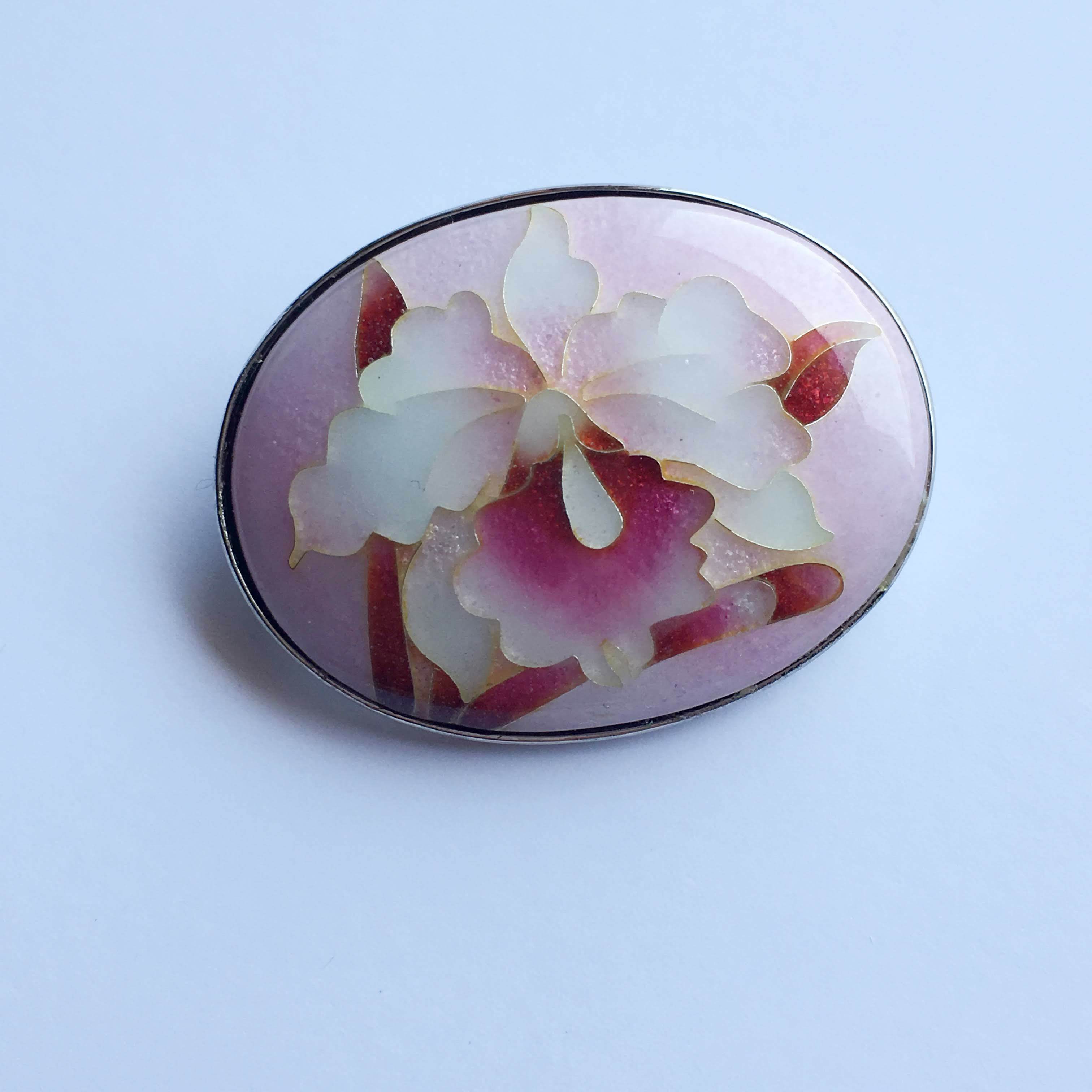 カトレア もも色 七宝焼のブローチ 純銀張有線七宝